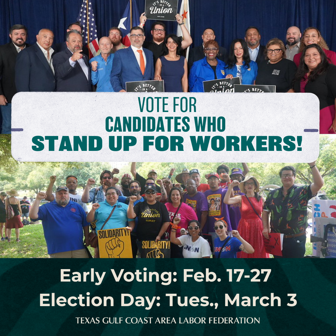 to advocate for working people in the Texas Gulf Coast. We mobilize our members and community partners to demand a fair shot at better lives for all – regardless of the color of our skin, which country we come from, or whom we love. We fight for working families by electing labor champions, coordinating campaigns to expand protections in the workplace, and partnering with community allies to improve the lives of our entire community.