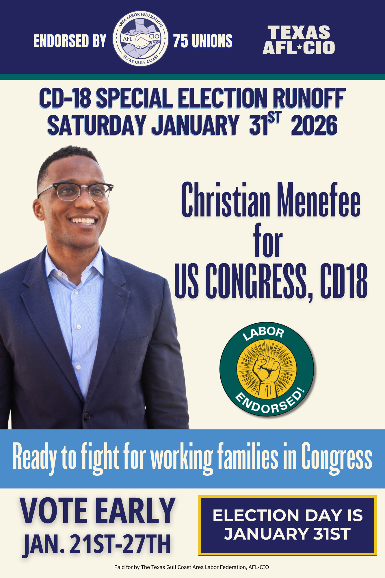 As Harris County Attorney, he has fought side-by-side with unions to ensure County employees and contractors earn a living wage, are safe on the job, and have a voice at work. We know he’ll fight for working people in Congress because he has been in the trenches with us here in Harris County.
